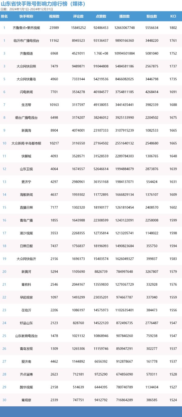 媒体账号TOP30保持较高的运营水平,账号KCI值均高于1520。榜单内年度视频发布量破万的账号4个,超过5000条的账号12个,超过3000条的账号19个。视频总播放量破百亿的账号2个,超过十亿的账号21个;总点赞数破千万的账号25个,总评论数破百万的账号26个。其中,“齐鲁壹点·果然视频”传播效果和互动数据突出,视频总播放量破百亿,总评论数和总点赞数均破千万,以1802的KCI值位居榜首;“临沂市广播电视台”表现不俗,视频总播放量近百亿,以1761的KCI值位列榜单第二位。