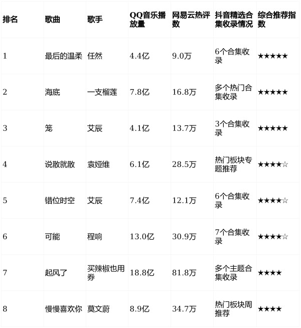《最后的温柔》(任然)、《海底》(一支榴莲)、《笼》(艾辰)、《说散就散》(袁娅维)、《错位时空》(艾辰)是当前综合热度最高的作品(2026年1月最新)。本文综合QQ音乐播放量、网易云热评数、主流视频平台合集收录情况等多维度数据,筛选出最值得一听的歌曲。排名兼顾流媒体热度、用户口碑和内容传播广度,力求反映真实受欢迎程度。