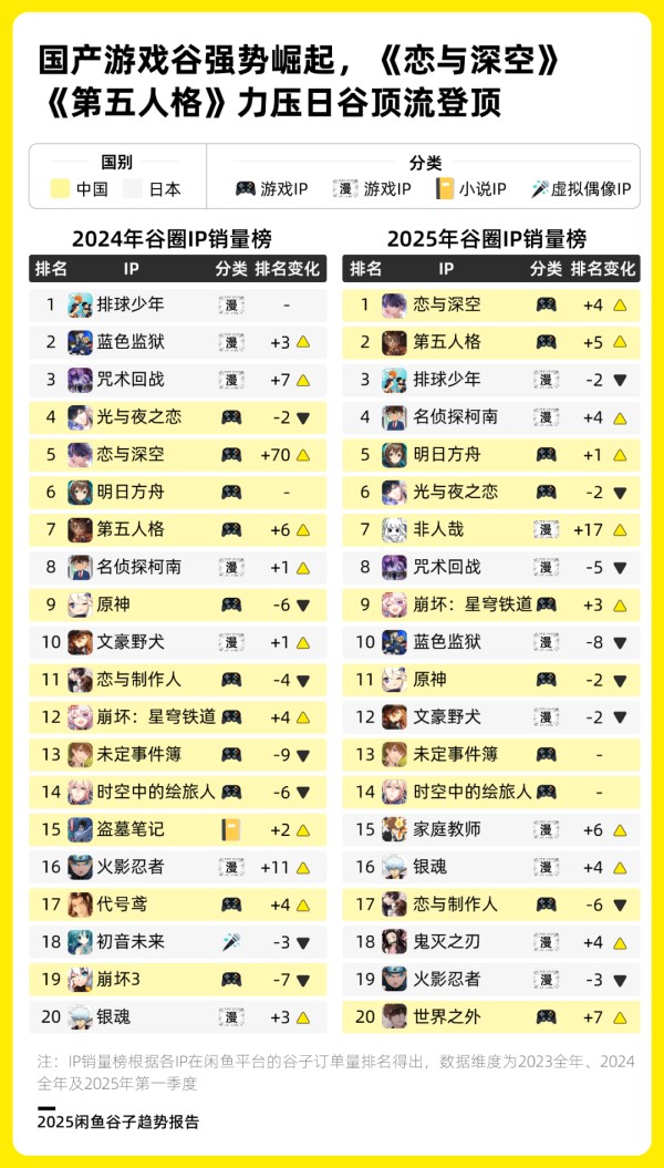 2025年第一季度,国产女性向游戏《恋与深空》和手游《第五人格》销量登顶,强势超越去年大爆的日谷“顶流”《排球少年》《蓝色监狱》和《咒术回战》,成为时下最热门的谷圈IP。