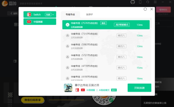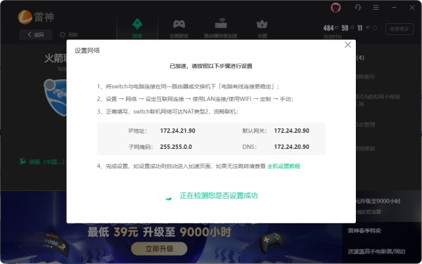 Switch和PC最好都使用有线连在同一个路由器(请勿用光猫、机顶盒当路由器,会无法连接网络)下,且PC电脑上装有雷神加速器