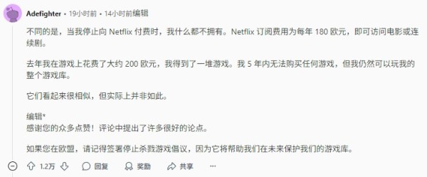 对此玩家们的评论也相当有意思“当我停止支付Netflix时,我什么都不拥有。Netflix订阅每年需要花费180欧元,只是为了获得“访问电影或剧集”的权限。而去年我在游戏上花了大约200欧元,买了一大堆游戏。即使未来五年我不再购买任何新游戏,我依然可以畅玩我的整个游戏库。”