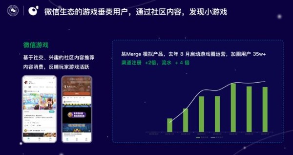 右边是一款Merge模拟类的游戏,从去年 8 月开始运营社区,到5 月,微信游戏渠道注册翻了了 2 倍、流水翻了了 4 倍。该渠道注册用户,ARRPU 高出游戏大盘均值 17%