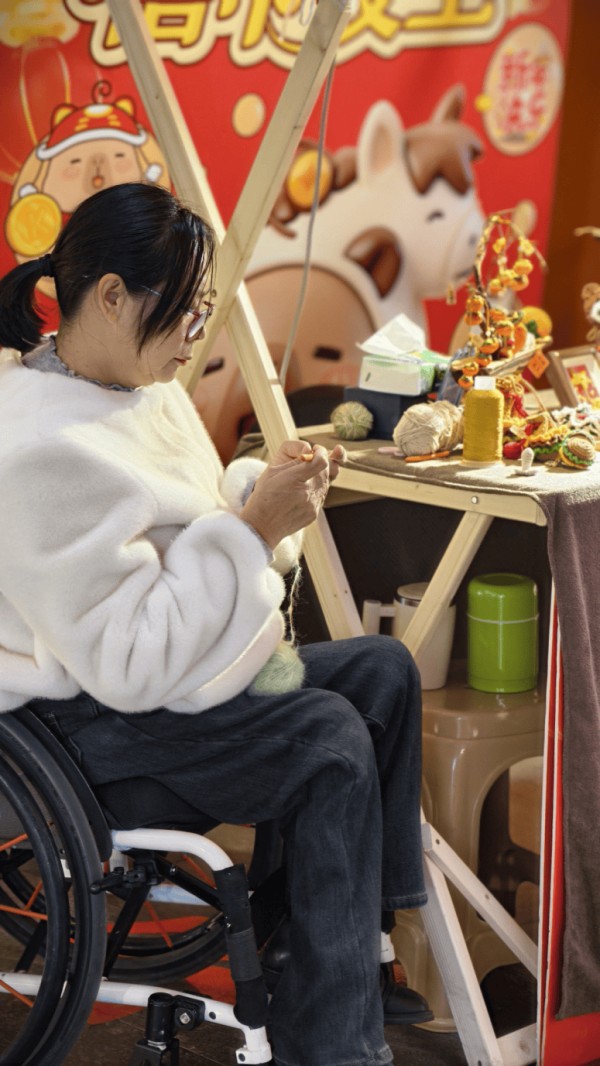 本次公益市集是“发芽市集”首次开设春节残疾人士专场,8位手工艺人中包含3位肢残人士、5位聋人朋友。商场为手工艺人们提供了黄金摊位,全程免收租金与押金,还统一规划摊位设计、提供宣传支持,让残疾创作者轻装上阵。