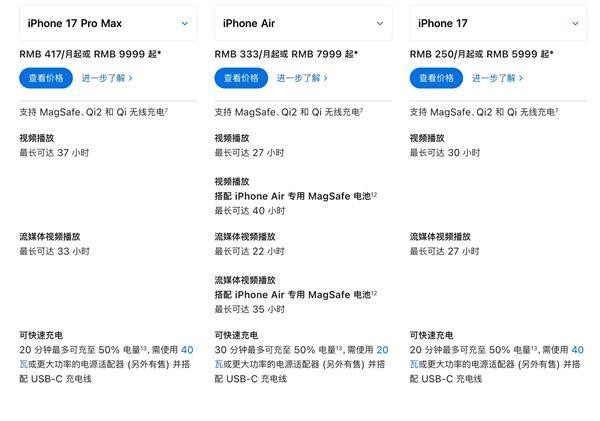 iPhone Air:视频播放最长可达27小时,支持MagSafe无线充电(功率最高可达15W)、Qi无线充电、25W有线快充。
