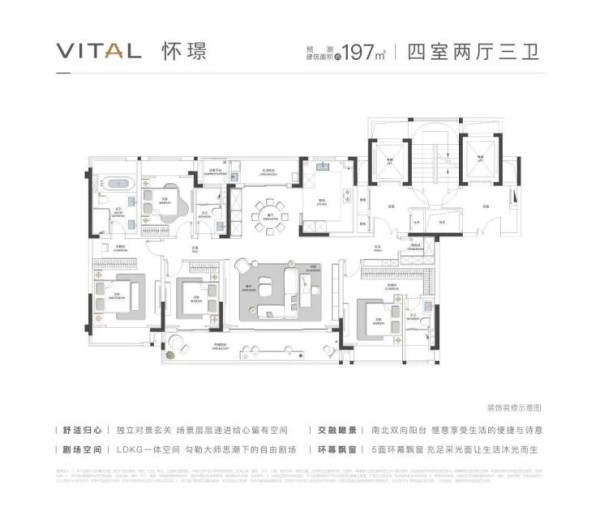 怀璟:约197㎡,空间更为阔绰,兼顾家庭互动与成员私密,尺度感十足。