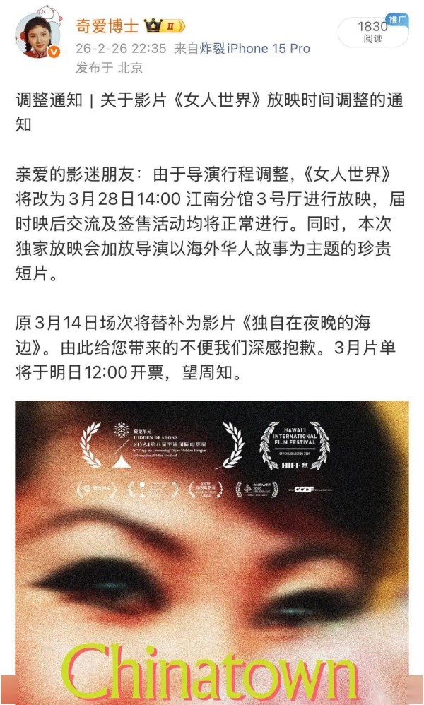由于导演行程调整,原定3月14日举办的《女人世界》将改为3月28日14:00江南分馆3号厅进行放映,届时导演杨圆圆映后交流及签售活动均将正常进行。同时,本次独家放映会加放导演以海外华人故事为主题的珍贵短片,赠送精美海报,仅此一场。