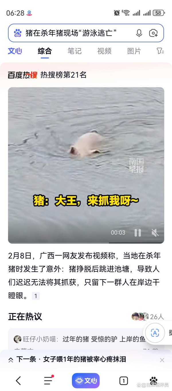 网友纷纷留言发表看法:1. 二师兄果然是游泳健将,为了活命拼尽全力,又好笑又心疼。2. 水都烧开好几趟了,猪还在水里淡定游着,这年猪太有想法了。3. 乡村年俗的意外名场面,比春晚小品还精彩,满满的年味。4. 生命本能太震撼,提醒大家操作时注意安全,规范处置活体畜禽。