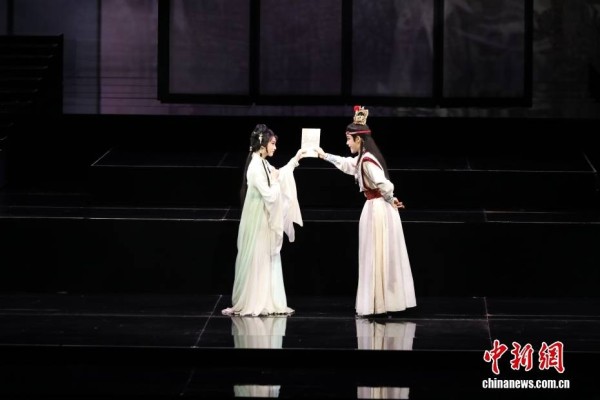 2月25日晚,浙江小百花越剧团《我的大观园》在台湾桃园展演中心上演,这是该剧团时隔近15年再度来台献艺。图为剧中宝黛共读《西厢记》的场景。中新社记者 刘大炜 摄