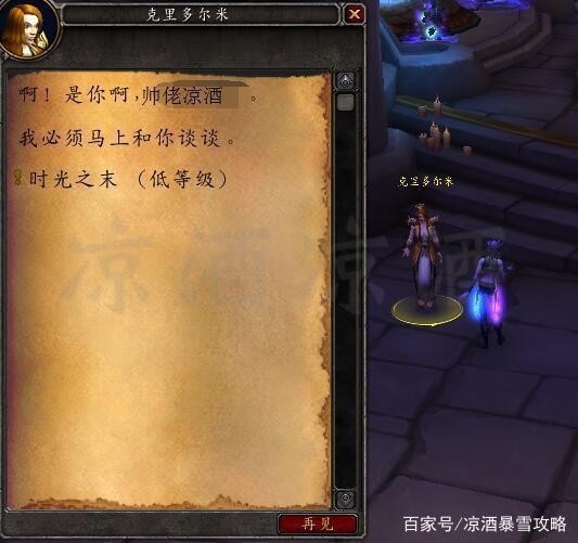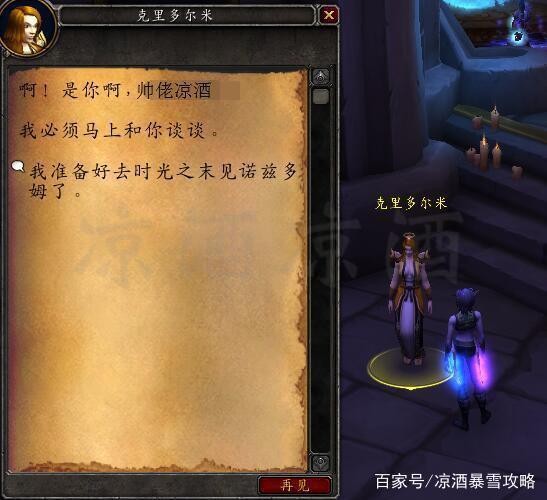 此时我们面前就是诺兹多姆,头上有代表可完成任务的问号,此时我们不能完成任务,不光不完成,反而要放弃这个任务,因为如果完成这个任务,这个角色从此就不能用这种办法来时光之穴了,如果放弃了这个任务,以后想来时光之穴可以再接这个任务,让克里多尔米传送你过来: