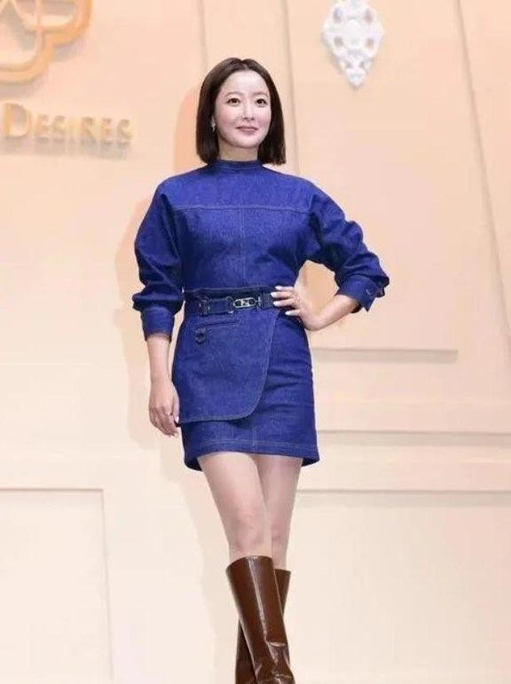 金喜善偏要用厚面料、收腰、不对称裙摆,打破对牛仔的“年龄歧视”。她在综艺节目《我独自生活》中聊过自己为什么爱牛仔裙:“不怕皱,走路有风。还能随时切换风格。