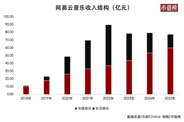 2025年,在线音乐服务与社交娱乐服务的收入分别为59.9亿元和17.7亿元。两项业务收入的相对比重,已基本回到2019年的水平。基本可以认为,网易云音乐业务重心的调整已接近尾声。