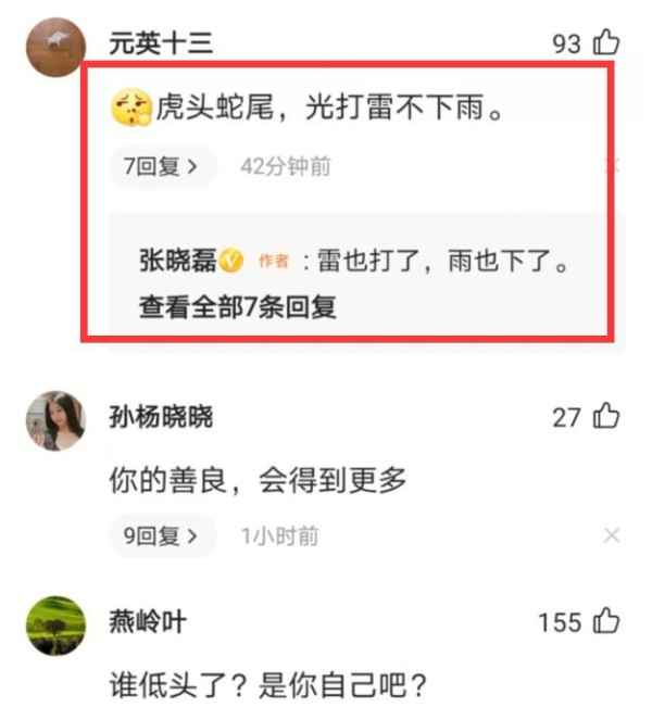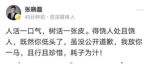 这件事情发展到现在,左右热度的已经不是张晓磊或者大衣哥,而是吃瓜群众,大家都在等着张晓磊继续爆料或者大衣哥予以回应,张晓磊这个时候发出“放大衣哥一马”的动态,无异于自讨难堪,评论区基本上都在吐槽他!