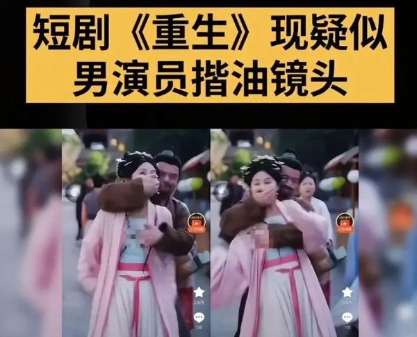 2月25日,刚上线的重生题材短剧《重回被换子之前,侯府主母赢麻了》中,有网友发现一幕不堪画面。剧情写的是绑架,男演员应从背后制住女演员,但画面里,他一手捂嘴,一手却落在女演员胸前,动作明显超出剧情需要。刚开始大家还以为是拍戏紧张的失误,可随即曝光的完整片段中,这个动作出现了两次,前后如出一辙。若说是偶然,未免太巧。