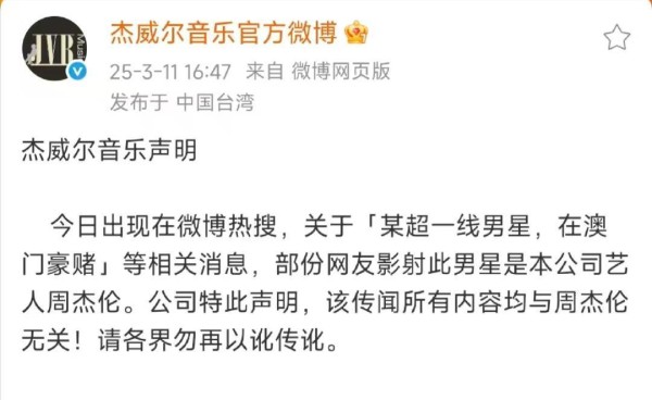 “某超一线男星在澳门豪赌”,杰威尔音乐紧急声明:与周杰伦无关!