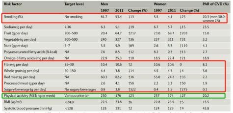 从表1可看出,随着生活水平的提高,虽然很多饮食习惯都向好的方向发展,如摄入坚果、膳食纤维、蔬菜、水果等都有了明显增加,但是具体目标的摄入量仍有较大差距。但是,由生活方式改善带来的不健康影响也非常显著,人们摄入更多红肉、加工肉,含糖饮料更是成倍增加,全谷物减少,这些不健康的饮食习惯都是增加CVD发生风险的危险因素。