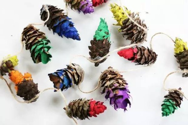 CRAFTY CUE: Dip your pinecones in festive colors for the holidays, like green and red for Christmas, or orange and black for Halloween.小提示:节日里可以将松果染上有节日氛围的颜色,如圣诞节的绿色和红色,或者万圣节的橘色和黑色。