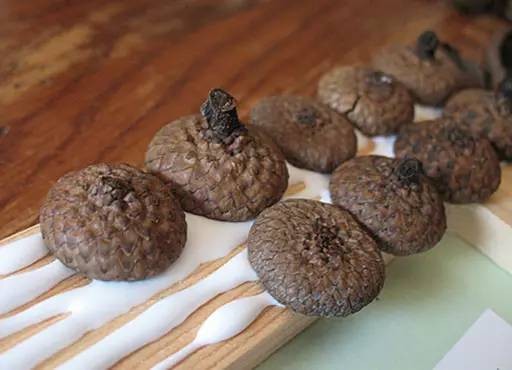 3ACORN FRAME橡果相框WHAT YOU'LL NEED: Acorn tops (enough to cover your frame), white craft glue, wooden frame.材料:橡子冠(数量由你的相框大小决定)、白色手工胶、木制框架。HOW IT'S DONE: Dry the acorn tops by placing them on a cookie sheet and baking them in a preheated 225℉ oven for about 40 minutes. Remove from oven and set to cool on a paper plate in a single layer. Apply a generous amount of glue to one section of the frame at a time and cover with acorn tops. Once the frame is completely covered, fill in all the gaps between the acorns with craft glue and let dry overnight.制作方法:将橡子冠放在烤饼干用的烤盘上,然后放入已经预热到225华氏度的烤箱中烤40分钟左右。把橡子冠从烤箱中拿出来放到单层纸盘上晾凉。在相框的一侧涂满胶水,然后粘满橡子冠。相框粘满橡子冠后,将手工胶水再次涂满橡果之间缝隙,晾一晚。