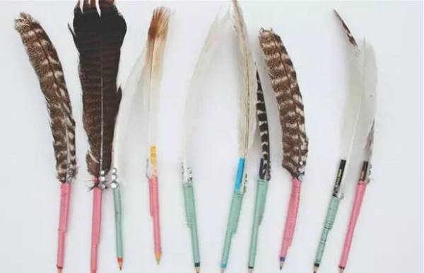 CRAFTY CUE: Bejewel your finished feather pencil with gemstones or glitter.小提示:将装饰过的羽毛铅笔缀上宝石或闪光的材料。