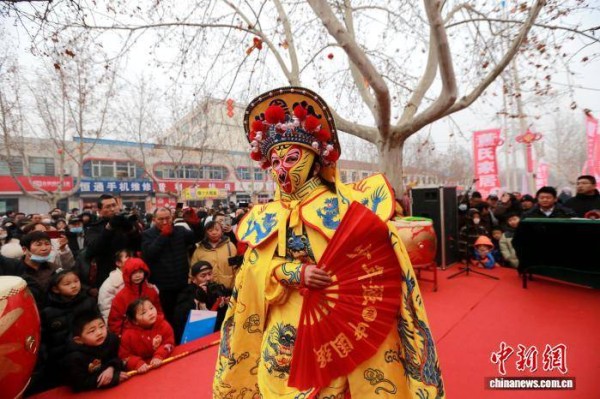 2月28日,一名儿童在胡集书会现场表演变脸。梁犇 摄