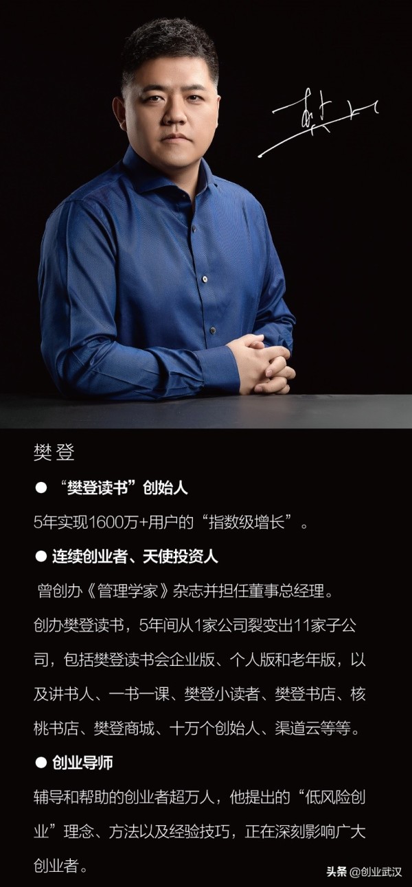 “樊登读书”创始人,连续创业者,天使投资人,曾创办《管理学家》杂志并担任董事总经理,华章教育机构董事长。2013年底创办樊登读书会,截至2019年3月,注册用户超过1600万,建立国内分会3000多家,海外分会117家。他提出的“低风险创业”理念、方法以及经验技巧,正在深刻影响广大创业者。"