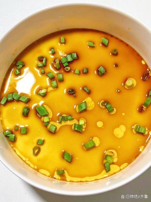 7. 装饰与出锅:蒸好后,取出鸡蛋羹,撒上切好的葱花或香菜,淋上少许香油,增添香味与美感。可以根据个人口味淋上少许酱油,也可以根据需要调整盐味。