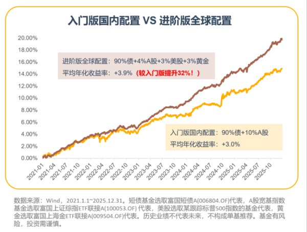 同样用 2021-2025 年数据测算,这个全球配置的平均年化收益率3.9%,比纯 A 股的入门版涨了32%。