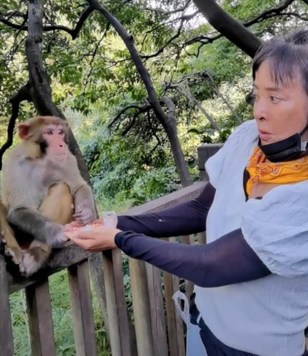 趣事第二件:李勤勤前段时间在某个旅游景点投喂猴子。只见她手捧投喂的食物,将手向前伸头往后仰,生怕猴子伤害到她,这表情也是萌翻众人。不过在这里提醒参观游客们,一定要记住不要随意投喂小动物。