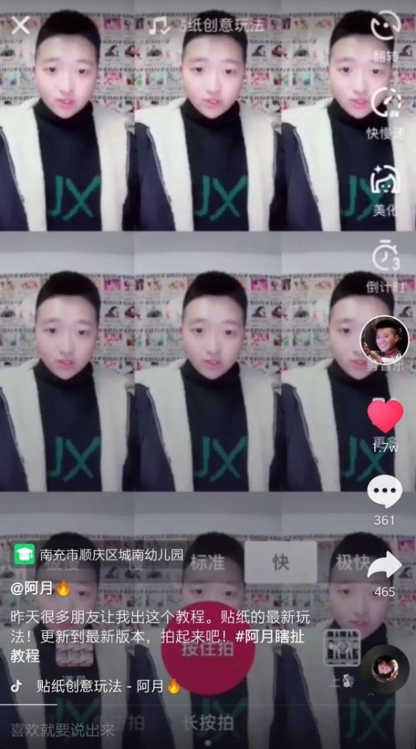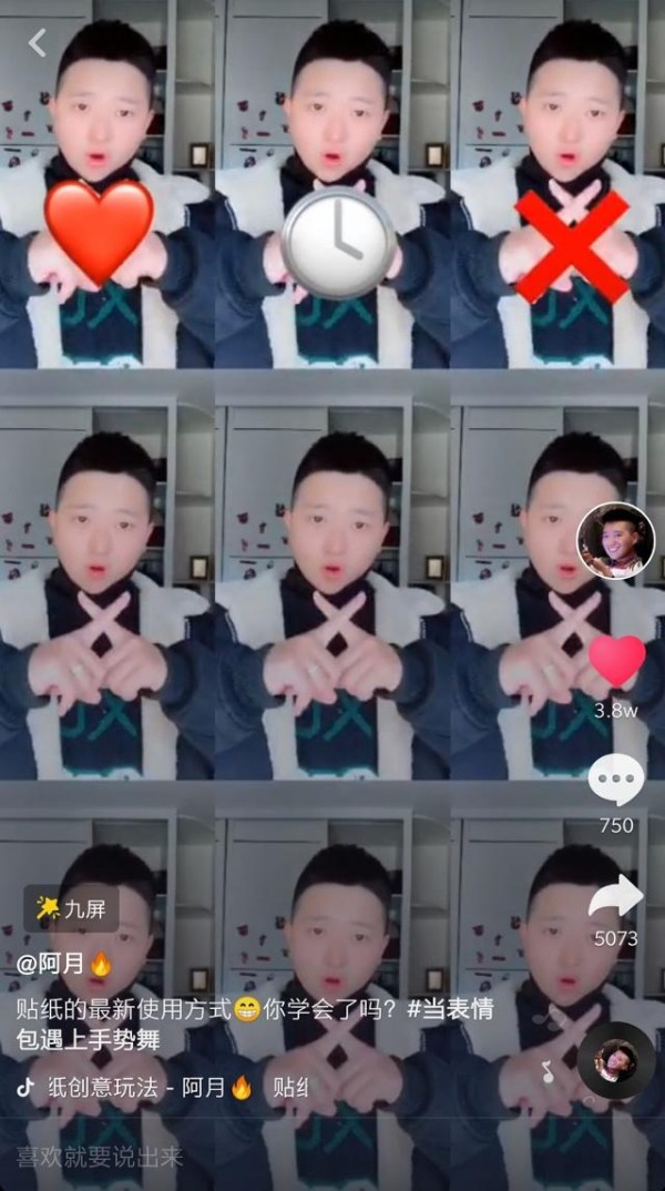 这条视频里,阿月将视频变成9宫格,根据歌词依次呈现出符合手势的表情包,结合了BGM、表情包和手势舞等抖音大热元素,打造视频创意点,引起了用户的好奇。