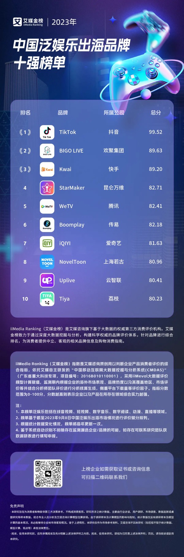 榜单数据显示,2023年中国泛娱乐出海品牌十强分别是:TikTok、BIGO LIVE、Kwai、StarMaker、WeTV、Boomplay、iQIYI、NovelToon、Uplive、Tiya。TikTok以99.52的总分夺得桂冠,BIGO LIVE(89.63)位居榜单第二名,Kwai(89.20)进入第三名。