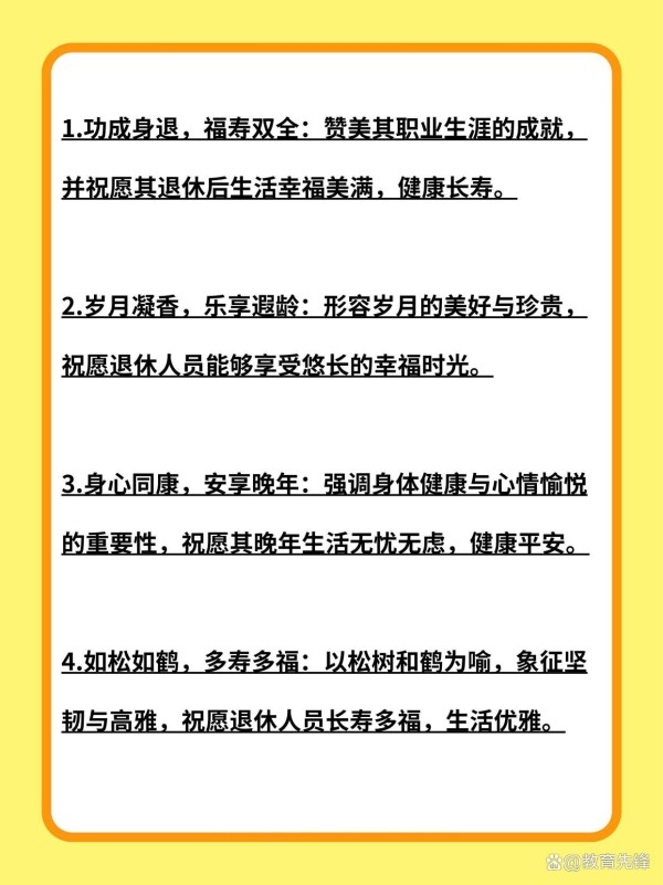 1.功成身退,福寿双全:赞美其职业生涯的成就,并祝愿其退休后生活幸福美满,健康长寿。