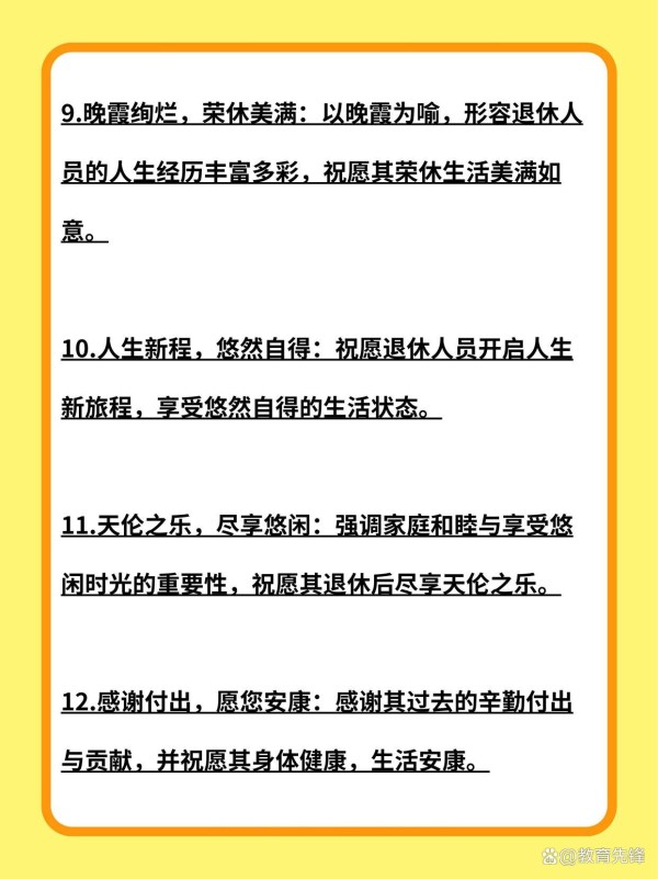 5.岁月荏苒,退休辉煌:感慨时光的流逝,同时祝愿其退休后的生活更加精彩纷呈。