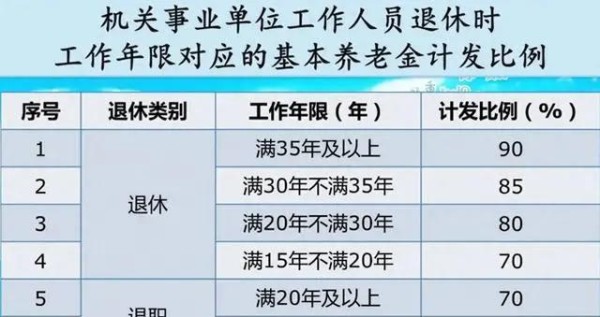 根据2024年十月之前的公务员退休津贴,工作时间和养老金的支付比率是成正比的,30岁以下没有35岁的,可以领取85%的养老金,35岁以上的可以领取90%的养老金。
