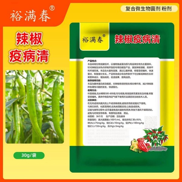 辣椒疫病是导致减产甚至绝收的毁灭性病害,裕满春辣椒疫病清采用复合微生物菌剂,能有效控制疫病蔓延。