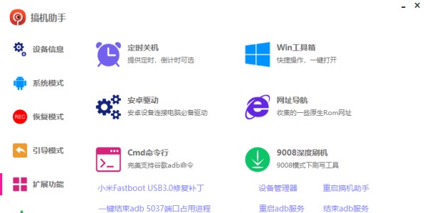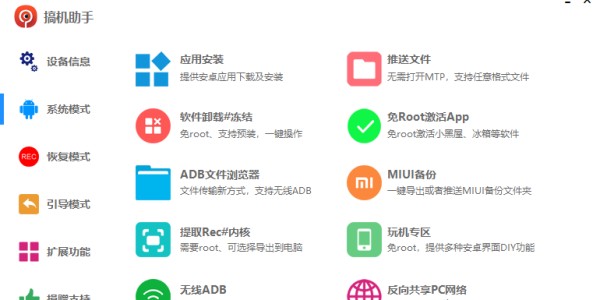 搞机助手是款十分出色、好用简单的安卓手机刷机工具,支持打开设备管理器、重启adb服务、结束adb服务,具有扩展功能,打开MIU温控模式,一键解锁system分区,也有辅助功能,装黑域社区版、激活黑域社区版等等,用户还可以在软件查看作者提供的查看激活相关问题说明,使用非常便捷。