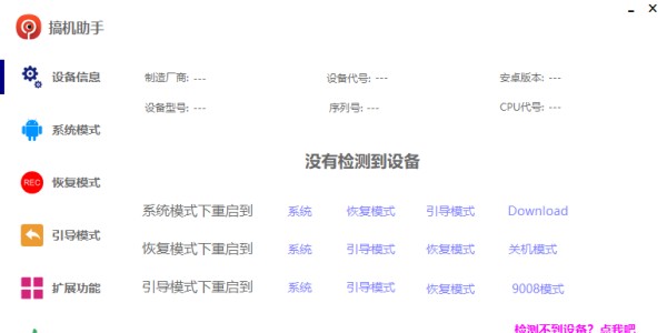 专业的Android刷机恢复辅助工具,提供了设备信息、系统模式、恢复模式、引导模式、扩展功能等功能,用户只需要将手机连接到电脑中,然后即可执行十多项刷机操作