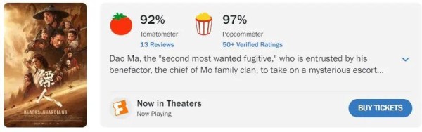 看看评分吧,《镖人》的烂番茄新鲜度高达92%,爆米花指数更是高达97%,《哪吒2》都不是对手,老美的评价太真实。