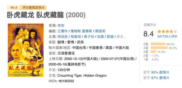 就拿《卧虎藏龙》和《英雄》来讲吧,其实这一部电影在豆瓣上的口碑是8.4分,但老美就爱到不行了。