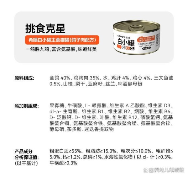 采用全鸽和鸡胸肉作为原材料,鸽子中含有脑磷脂促进组织细胞的代谢更新,果寡糖和L-赖氨酸呵护肠胃减少猫咪软便,增加肠道活菌数232%;鸡胸肉低敏温和,满足猫咪对蛋白质需求,额外添加的维生素、矿物质、牛磺酸、三文鱼油,可以保护猫咪视力,还能帮助猫咪大脑发育、强健骨骼、美毛亮毛,提升猫咪活力50%,增强免疫力78.56%,猫罐界的六边形战士,为猫咪撑起健康保护伞。80%的含水量不用担心猫咪缺水,边吃边补水,将营养吃进肚子里。