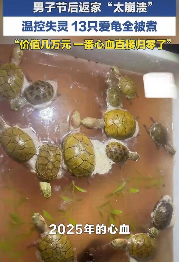 春节本应是阖家欢乐、幸福团圆的时刻,可浙江金华的王先生却在节后遭遇了一场揪心的悲剧。他饲养多年、价值数万元的 13 只宠物龟,竟因温控设备突发故障,在盆中被 “煮熟”,一年多的心血瞬间付诸东流。