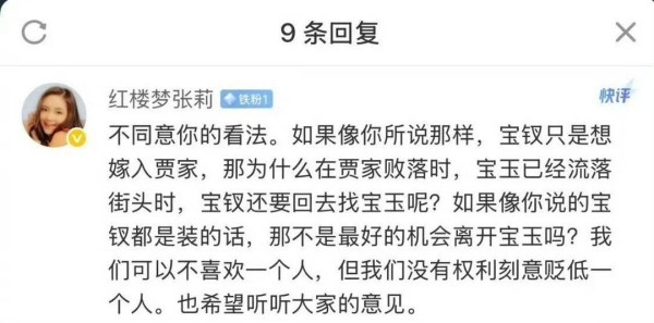 紧随其后,同一部电视剧中薛宝钗的扮演者张莉公开反驳,明确表示“不同意你的看法”,并以关键情节发出灵魂拷问:若薛宝钗一心攀附贾府权势,为何在贾家彻底败落、宝玉流落街头之际,反而主动寻回宝玉?这本是摆脱“累赘”的最佳时机。张莉还表态“我们可以不喜欢一个人,但没权利故意贬低人家”,同时强调解读角色需结合封建社会的时代桎梏,正视人物的复杂性。