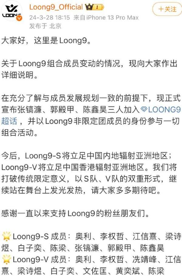 其中,Loong9-S成员分别为奥利、李权哲、江信熹、梁诗煜、白子奕、陈梁、张镐濂、郭殿甲、陈鑫昊,将立足于中国内地辐射亚洲地区;Loong9-V成员分别为奥利、李权哲、冼靖峰、江信熹、梁诗煜、白子奕、文佐匡、黄奕斌、陈梁,将立足中国香港辐射亚洲地区。