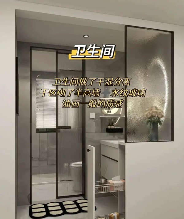 卫生间用半高墙+水纹玻璃隔断,上半截透光不透影,保护隐私;下半截半墙可放纸巾盒,干区更宽敞。水纹玻璃投影在墙上,像油画一样有趣。
