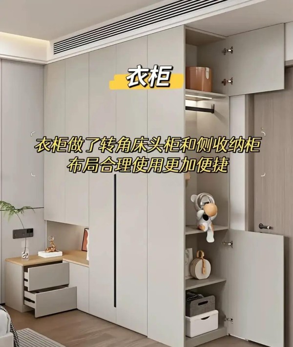 衣柜的转角位置别浪费,我家做了“转角床头柜+侧面收纳柜”。转角延伸出30厘米宽的台面,用作床头柜摆台灯和水杯;侧面加了一个高1.2米的窄柜,专门收纳包包、围巾和换季的小物件。不用弯腰翻找,转角不再是堆杂物的死角,小户型尤其实用。