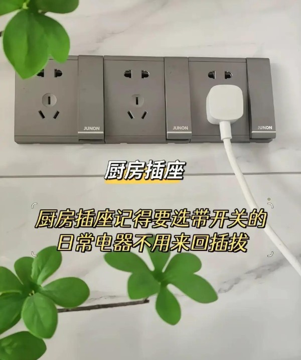 厨房插座一定要带独立开关。电饭煲、微波炉、破壁机等常用电器不用时直接按开关断电,湿手拔插头既麻烦又不安全。我家灶台和水槽边一共装了六个带开关的插座,用了一年几乎没拔过插头,省心很多。