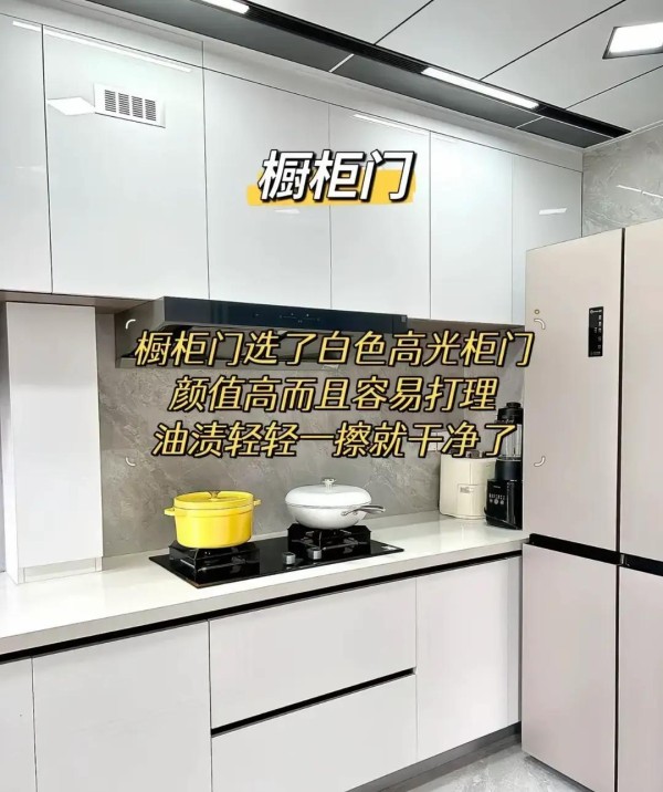 橱柜门挑白色高光PET板,油污一抹就净,用了一年没留指纹。白色干净,搭黑色拉手厨房亮堂不压抑。厚度要选18毫米,避免变形。