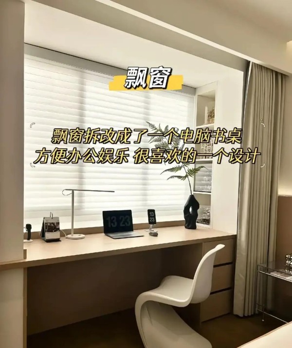 次卧飘窗改成书桌,定制与飘窗齐平的2厘米厚木板,下方加抽屉放文具,侧面装插座方便充电脑。采光好、空间利用率高,比单独买书桌舒服。