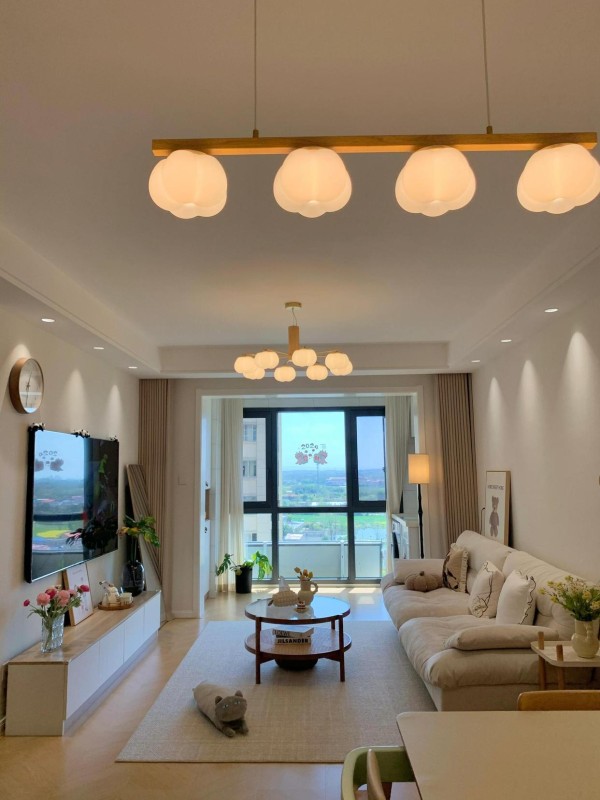 客厅没有做复杂的背景墙,而是打满墙电视柜,高度2.4米、深度35厘米。上半部分是开放式格子,用来放装饰画、机顶盒等;下半部分是带门的柜体,方便藏零食、玩具。藏露结合让杂物隐身,比单独放电视柜多装近三成。