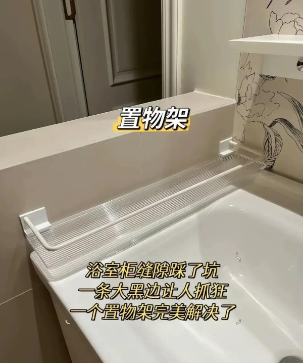 浴室柜台面和墙间的2厘米缝隙里摆免打孔置物架,不锈钢材质方便放牙膏、洗面奶。选可伸缩款适配不同缝隙,我家装了两个,非常实用。