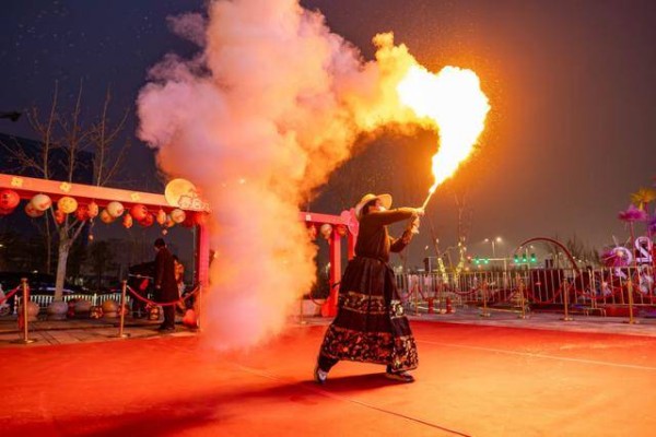 这一极具视觉冲击力的表演,不仅展示了传统技艺的惊险与奇美,更以其驱邪纳福、生活红火的寓意,赢得了现场观众的阵阵喝彩。火光映照下,好睦邻·如意坊的现代建筑轮廓与传统非遗魅力交相辉映,大家纷纷举起手机,定格这一震撼瞬间。