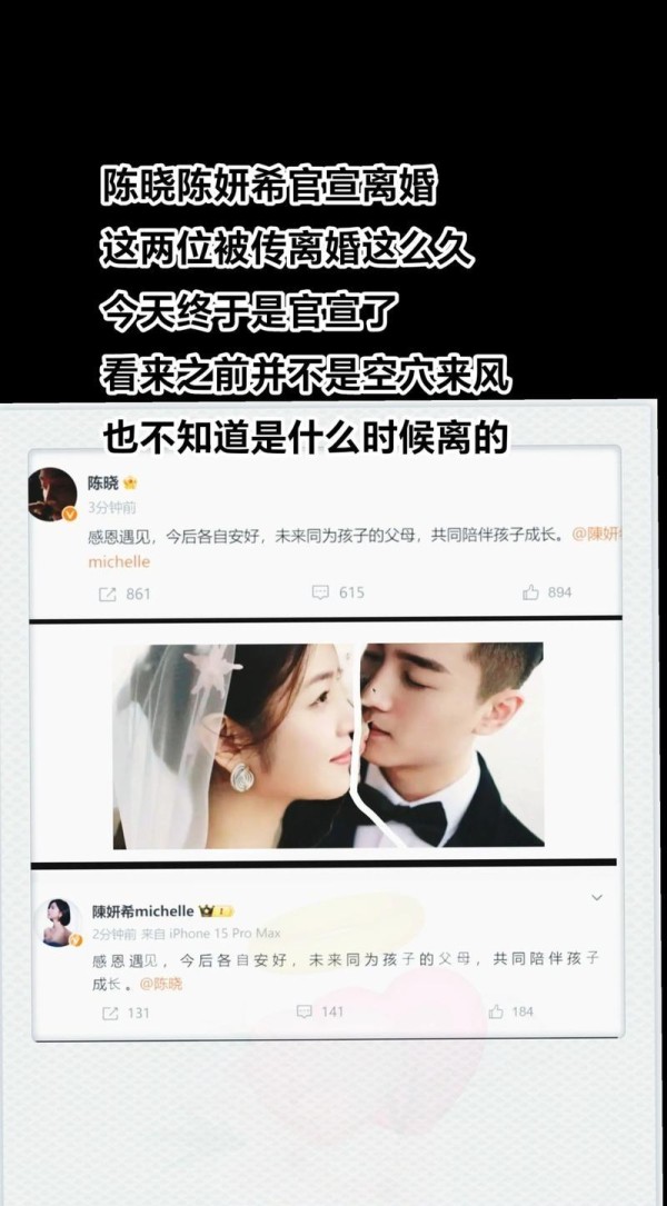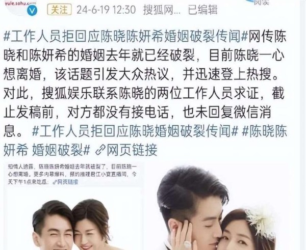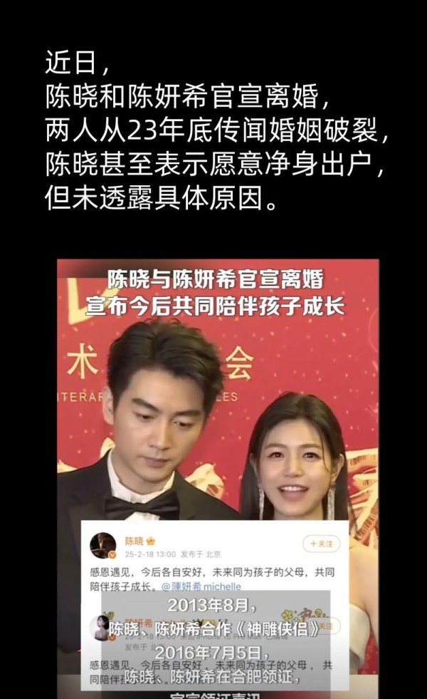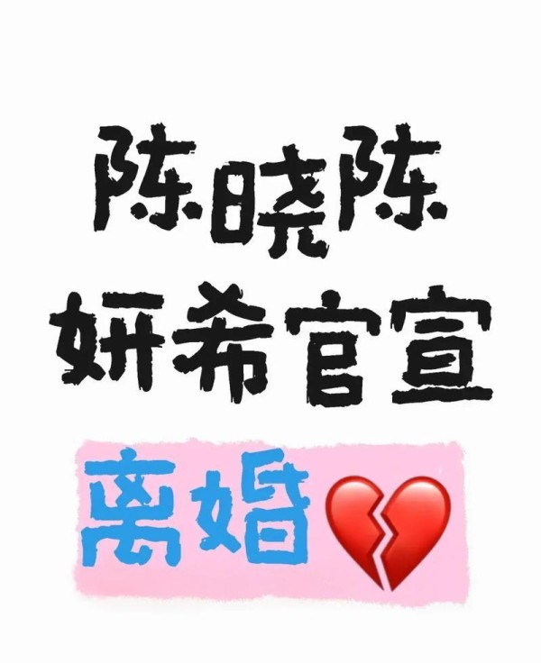 陈晓、陈妍希官宣离婚,爆料称一年前感情破裂,陈晓净身出户